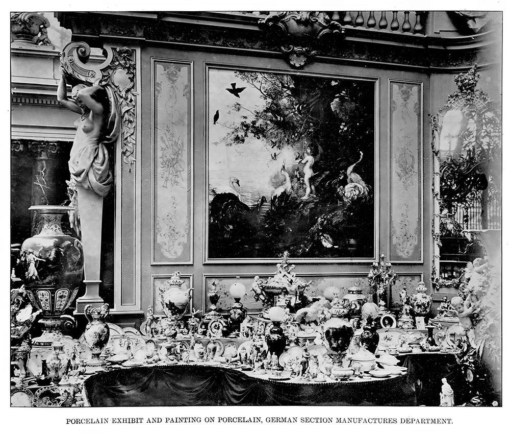 A photograph of the German porcelain exhibit in the Manufactures and Liberal Arts Building at the 1893 World’s Fair. The porcelain punch bowl, now in the collection of the Art Institute of Chicago, can be seen in the center of the display table. [Image from Campbell, James B. Campbell’s Illustrated History of the World’s Columbian Exposition, Volume II. (M. Juul & Co., 1894).]