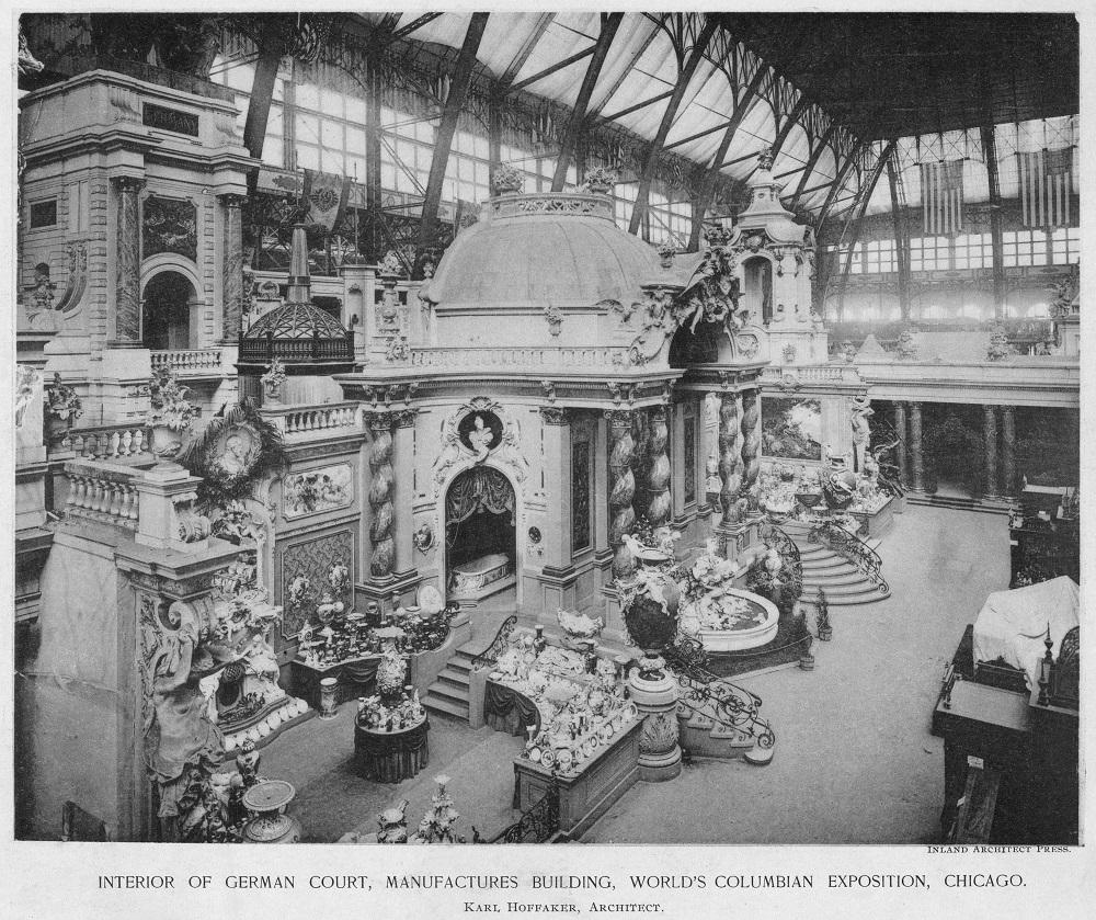 A photograph of the interior of German Court, showing the “Porcelain Porch” and exhibits from the Royal Porcelain Manufactory at the 1893 World’s Fair. [Image from Inland Architect and News Record Dec. 1893.]