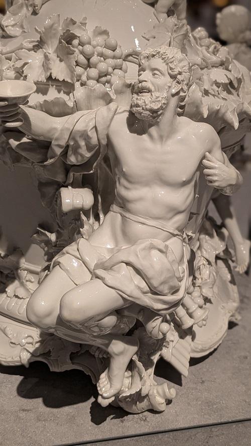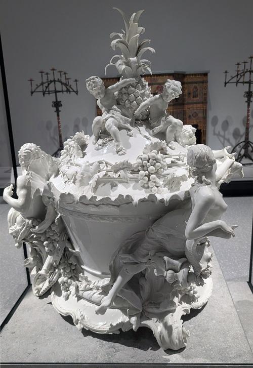 Designed by Alexander Kips and modeled by Ernst Wägner, the sculptural work features three figures bearing roses and grapevines encircling the base and three cherubs and a pineapple decorating the finial. The porcelain masterpiece appears to be the same item that sold at Christie’s for $35,000 in 2019.