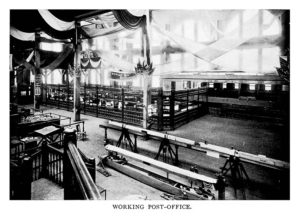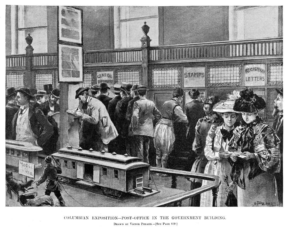 A photograph showing the working United States Post Office branch in the U.S. Government Building. [Image from Johnson, Rossiter A History of the World’s Columbian Exposition Held in Chicago in 1893, Volume 3: Exhibits. D. Appleton and Co., 1897.]