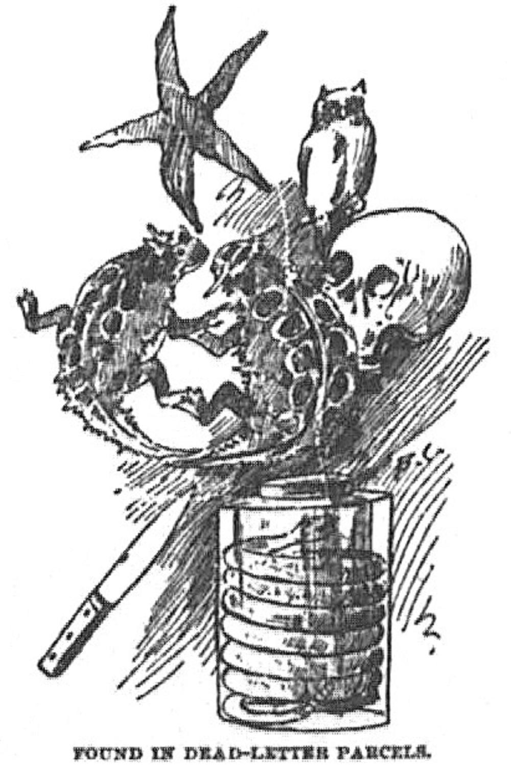 “To the average sight-seer the most attractive exhibits in the postal department are those which contain the unclaimed packages of the dead-letter office. … In truth it is a fitting accompaniment of an exposition intended to display all the products of soil, mine, and sea, for many of those products, including also the denizens of air, are to be found in these grotesque and strangely blended groups.”
