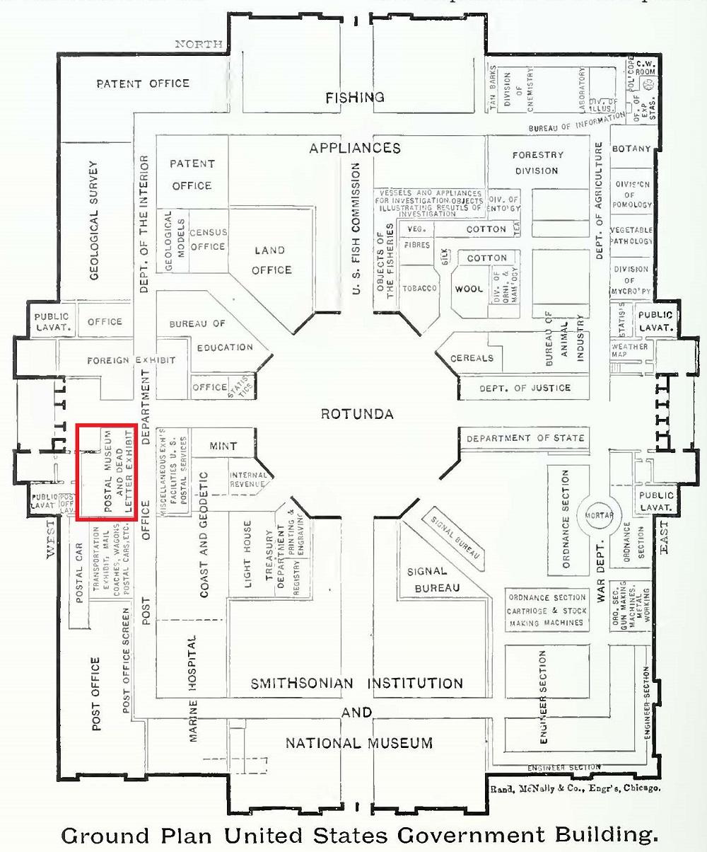 About a thousand items in the Dead Letter Office Exhibit were displayed in the southeast corner of the U.S. Government Building. [Image from Rand, McNally & Co.’s A Week at the Fair. Rand, McNally & Co., 1893.]