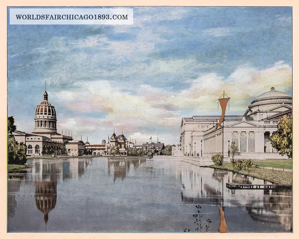 THE LAGOON IN FRONT OF THE ART PALACE.—It was not a very big sheet of water which lay just south of the Art Palace in the Exposition grounds. It was not imposing in dimensions, though it was by no means small, and it was not such a thoroughfare for launches and gondolas as were other lagoons and connecting straits, but it is doubtful if ever a sheet of water anywhere afforded fairer spectacles or if ever upon one of the same size occurred more pretty incidents of more importance. Here, under the shadow of the most beautiful of structures, was the water resting-place of the Fair. Here, too, was the scene of many various and interesting exploits. From the little platform seen extending out in the right foreground of the picture, were made the tests of the fly throwers among the champion fishermen of the world. Here were made other tests of interest pertaining to the water, and interesting to the world. This lagoon was just aside from the general water thoroughfare between the Grand Basin and the lake, and the drift of travel it caught was but a trifle. Undisturbed by the wayfarer, but most interesting, was the North Lagoon. The photograph reproduced is an almost perfect one. The Illinois Building appears inverted in the water; the flag from the Art Palace dips beneath the waves. The view to the westward is rounded out and complete. Squarely at the west end of the lagoon stands the Indiana Building, and over the wing of the California Building beyond it, in the far distance, looms up the Ferris Wheel, that haunting monster of the Fair.