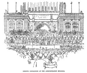 “The ceremonies of the opening day have been selected as the scene, when President Cleveland is delivering his address. The director-general [Davis] stands at one side of him, President Palmer at the other, While in the group upon the platform may be easily distinguished President Higinbotham, Daniel H. Burnham, Lyman J. Gage, William T. Baker, Vice President Stevenson, Secretary Gresham, Secretary Carlisle, the Duke of Veragua, his brother, the Marquis of Barboles, and several other well-known gentlemen. The only ladies who appear are the Dutchess of Veragua, her daughter and Mrs. Potter Palmer. This sketch is almost an exact copy of a photograph taken by Mr. Arnold at the moment the president was speaking.”