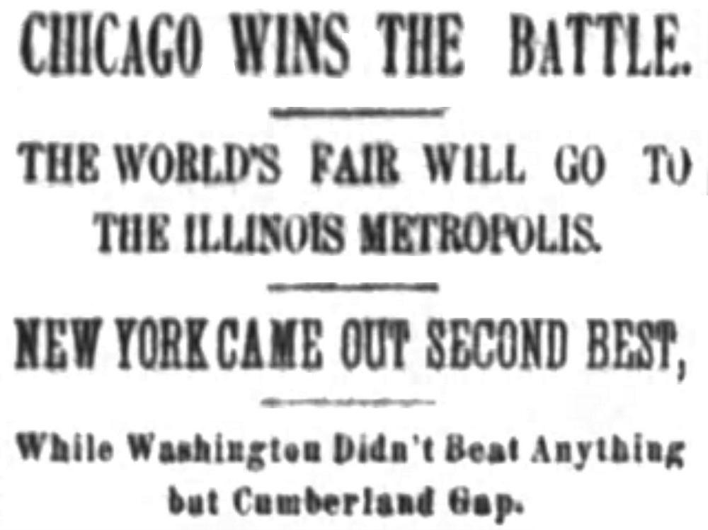 “Chicago Wins the Battle” read the front page of the Charlotte (NC) Observer on February 25, 1890. Chicago had beat New York, St. Louis, Washington (and Cumberland Gap) to win the vote in the House of Representatives for the honor of hosting the Columbian Exposition.