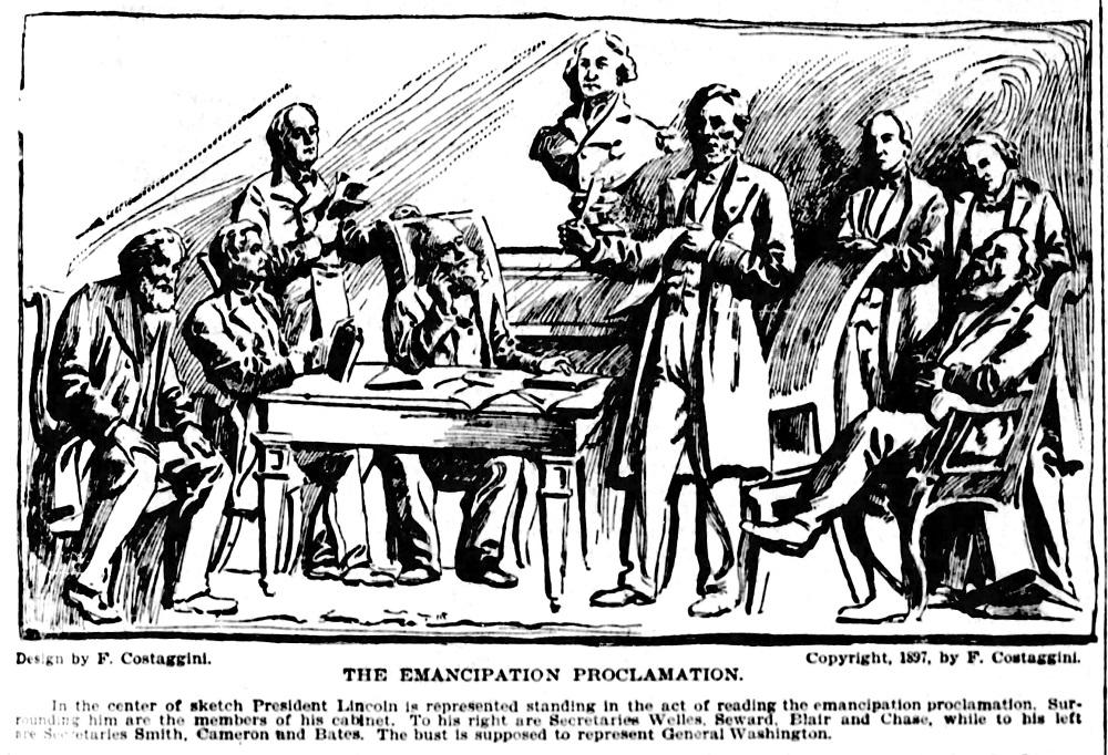 In 1898, United Press photographer George Grantham Bain, hoping to help the congressional committee take action, attempted to form a consensus among leading men and women of the day. He forwarded four suggestions with sketches by Costaggini. These included the already-debated “Last Spike” and “World’s Fair” scenes along with two Civil War era scenes the artist had prepared a year earlier, but which had been given no consideration by the Library Committee. One cartoon depicted “The Emancipation Proclamation by Lincoln” (January 1, 1863), with the president reading the declaration to his cabinet, and the other showed General Sherman’s Union Army passing the review stand of President Johnson (May 1865).
