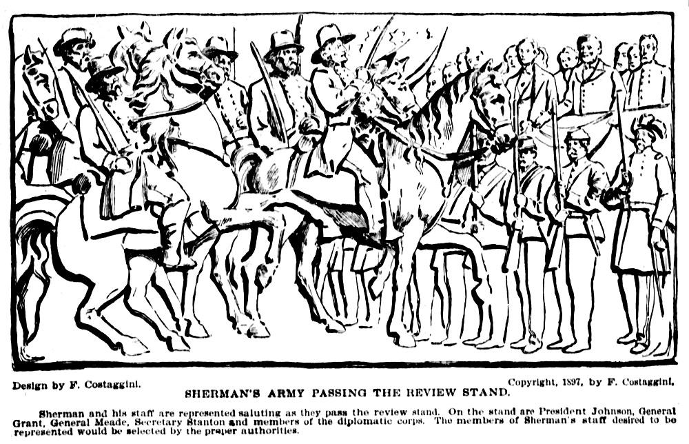 Depictions of any Civil War events within the frieze faced strong opposition from parts of the country. Shown here are Costaggini’s cartoons for a proposed panel depicting Lincoln’s Emancipation Proclamation in 1863 (top) and one showing General Sherman in the Grand Review of the Armies in 1865 (bottom). [Images from the Waco (TX) Times Herald Jan. 23, 1898.]