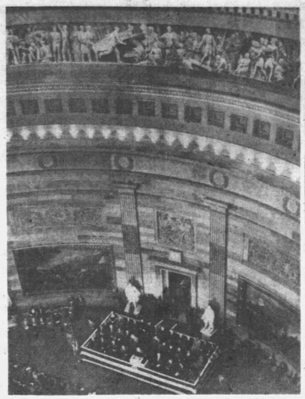 “The opening of the world’s fair is of more modern interest, and its depiction in a historical panel is, therefore, much more difficult, as practically all the persons represented are living and have great prominence in the nation. But it has been urged that this freeze is not for the men of today, but for posterity to witness, and that it would be useless to wait until all the participants in the affair have passed away before completing the great historical circle in the Rotunda.”
