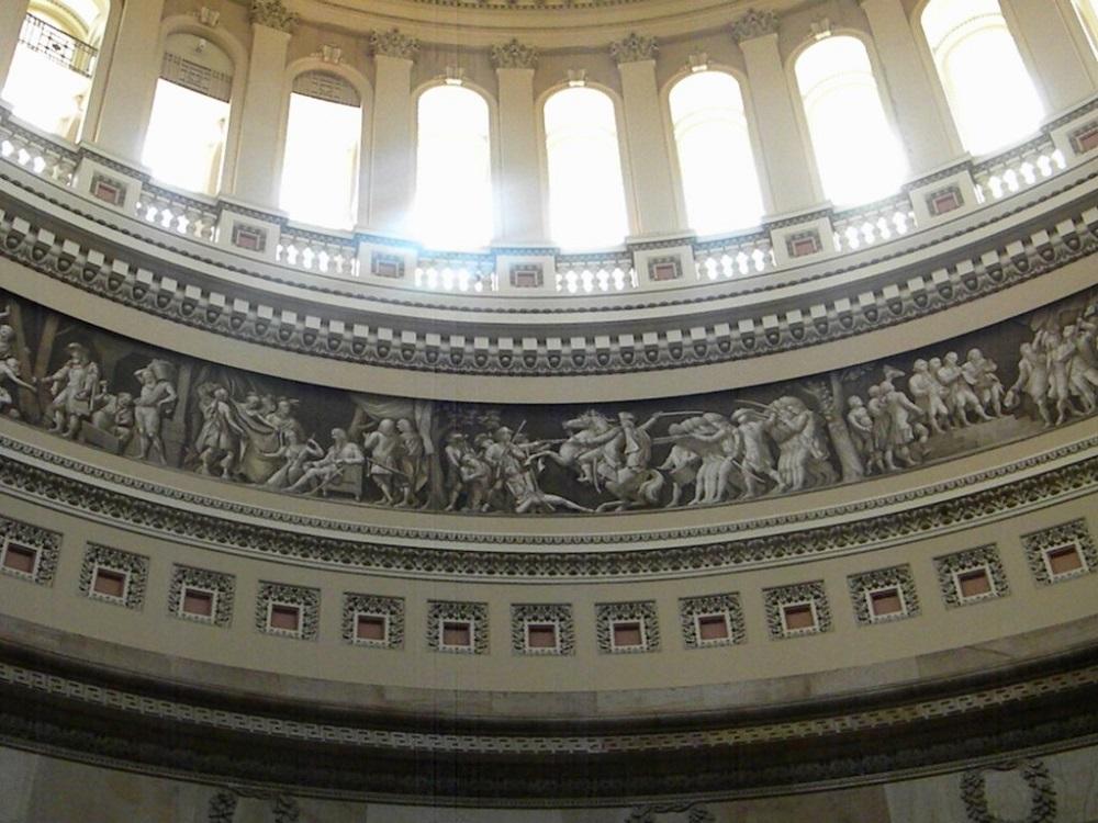 A portion of the Frieze of American History in the Rotunda of the U.S. Capitol Building, showing the panels for “Oglethorpe and the Indians” and the “Battle of Lexington.” [Photograph by ttarasiuk; image is available under Public License from Flickr.]