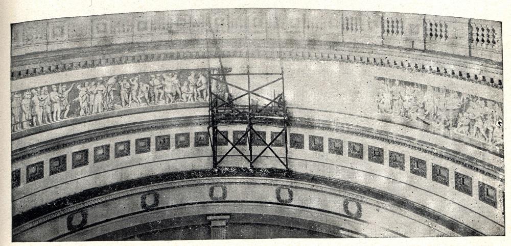 Memories of the 1893 World’s Fair receded further as the nation prepared to open the Louisiana Purchase Exposition in St. Louis on April 30, 1904. Just fifteen days earlier, Filippo Costaggini died at age sixty-six. Congress had failed to approve any of his designs while the “Abandoned Fresco” suffered damage from the elements. “Finish the Frieze,” implored the Evening Star a few days after Costaggini’s death. “The gap in the frieze should be a constant reminder to all members of Congress who pass through the rotunda of a neglected item of good governmental housekeeping, the care of which must at once be undertaken.” A report the following year shared optimism that the congressional Library Committee “speaks confidently of its ability to reconcile all divergent views.” No reconciliation came. As more years passed, additional suggestions for historical subjects to complete the decorative band rolled in, including scenes commemorating the opening of the Panama Canal in 1914 and Charles Lindbergh’s trans-Atlantic flight in 1927. Journalist Frederic J. Haskin summed up the situation in 1933: “That blank is Brumidi’s monument.”