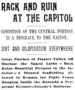 A headline in the Philadelphia Times on June 6, 1897, decries the sorry state of the U.S. Capitol and notes “disused scaffolding allowed to remain for eight years hanging inside the Rotunda a perpetual eyesore.”