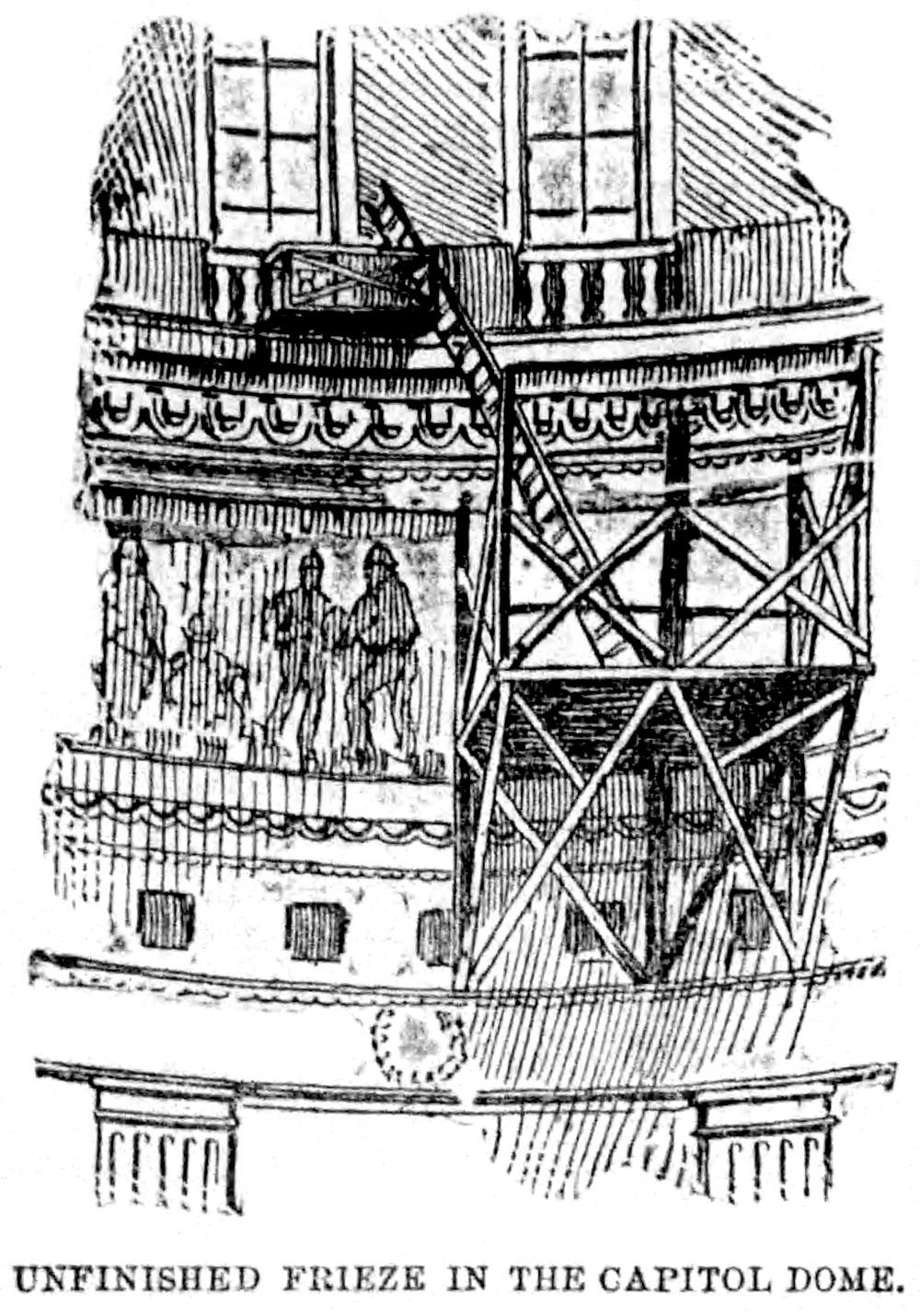 By the end of the century, the scaffolding had become a monument to an aborted project to decorate the Rotunda and an embarrassing failure of Congress. Three diagonal props of wood, each forty feet long, rested on the cornice of the great dome and supported a platform. Ropes and ladders gripped the rim of the upper gallery like fingers. For more than a decade, two foreign-born artists had toiled to paint the frieze, but work ceased in May of 1889 with the decorative band of historical scenes still incomplete. The ugly scaffolding remained, loitering in the Rotunda and calling attention to an embarrassing gap that greeted visitors for the next seventy-five years.