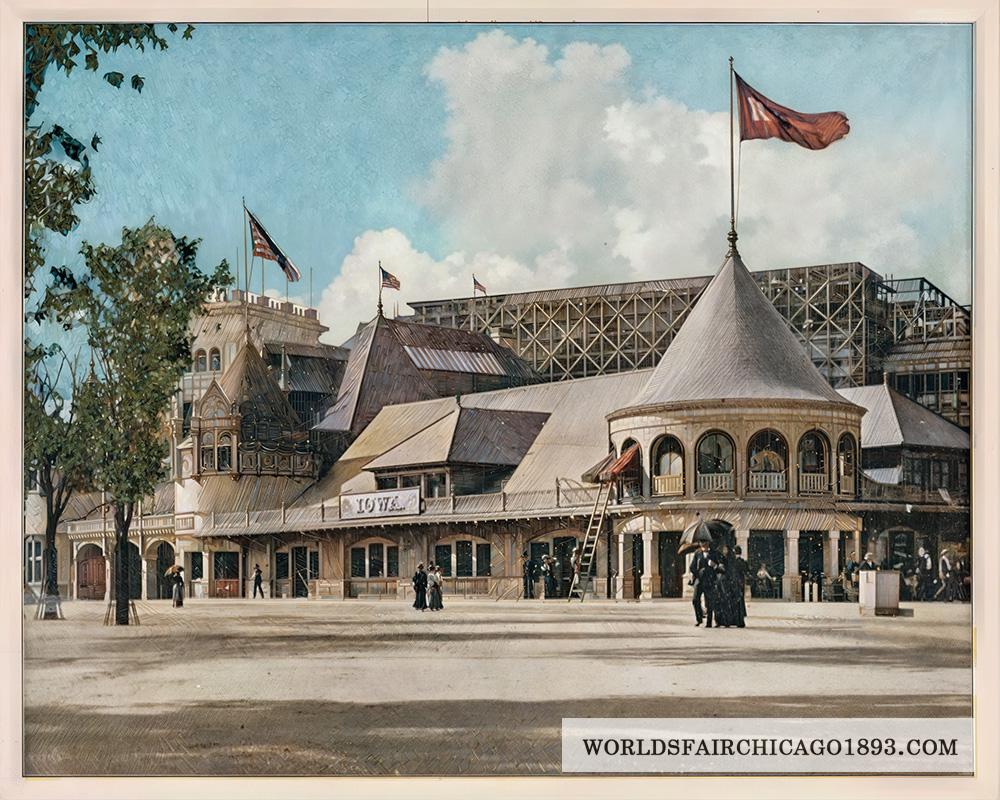 THE IOWA BUILDING.—The building of the State of Iowa occupied a very attractive place in the Exposition grounds. It was situated in the extreme northeastern corner of the Fair grounds; one of its fronts overlooking Lake Michigan. It had the additional advantage that it was composed partly of the old Jackson Park Pavilion, a stone structure standing in the park before the Fair, and one of considerable architectural merit. The main part of the Iowa Building conformed in a general way to the architectural style of its annex, and contained the state offices and reception rooms. There were some interesting exhibits, among which was a model of the capitol of the state, made of steel and glass, presenting a striking appearance and attracting much attention. What most interested visitors, though, was the display in the annex or old pavilion. The decorations were made of corn and other grains, and the effects produced were something inconceivable to those who had never before learned what could be accomplished in such direction with products of the farm. It is not asserting too much to say that the decoration of the interior of this pavilion accomplished in this manner would compare well with much of the work done elsewhere with paint and brush. It was a curious work with curious incidents. They drove a horse in one day with a load of something and left him standing by a pillar and he promptly began eating a painting done in grain as a mural decoration. But these were only incidents.
