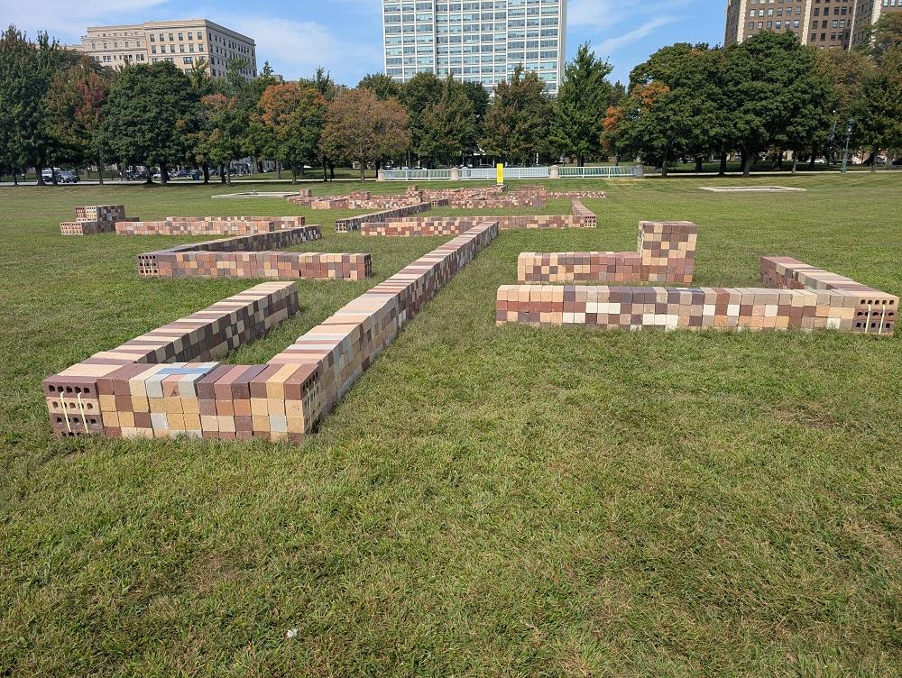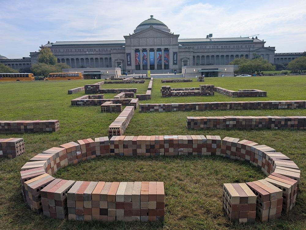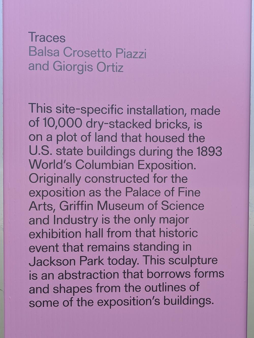 TRACES” by Balsa Crosetto Piazzi and Giorgis Ortiz sits on the lawn north of the Griffin Museum of Science and Industry. Low walls of stacked bricks form outlines meant to represent fifteen of the great palaces and smaller exhibit halls of the 1893 World’s Fair. A description from the CAB explains: