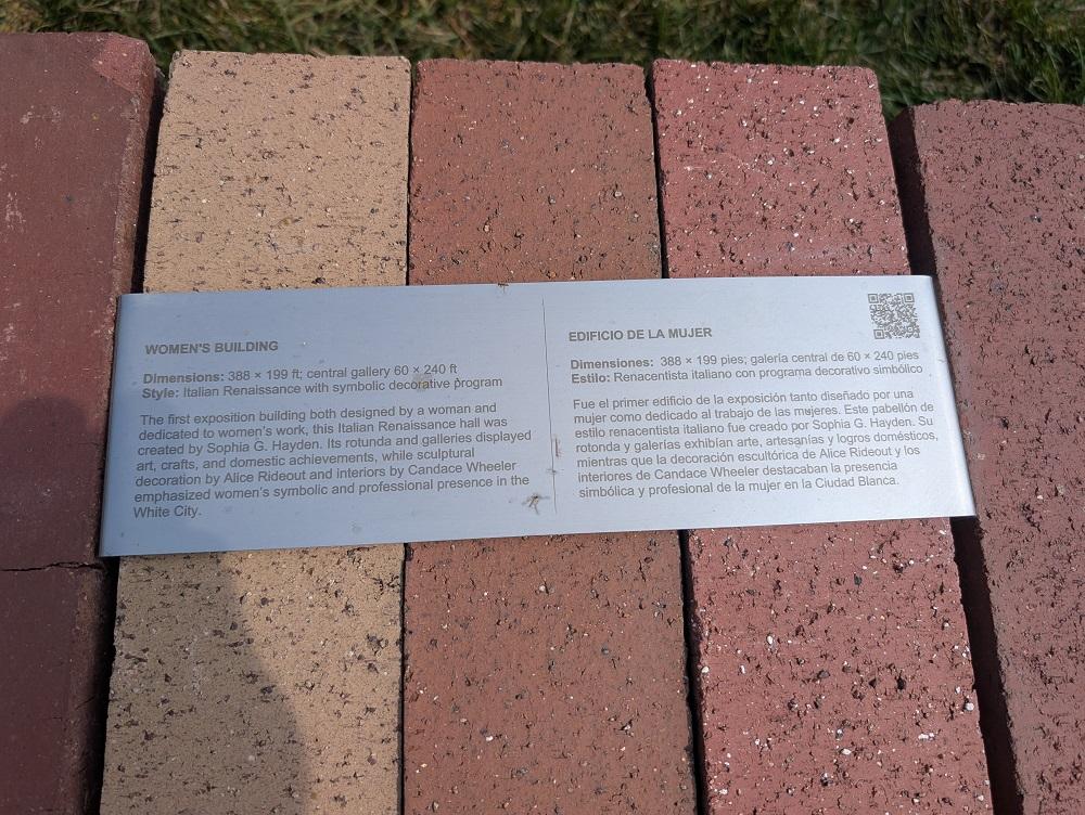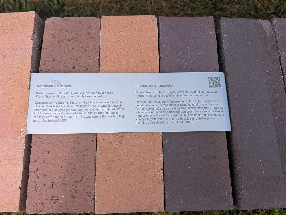 An observer would be hard pressed to detect much of a resemblance of the shapes created by the brick walls to any of the original white palaces, save perhaps the Palace of Fine Arts with its distinctive east and west wings. The brick patterns are arranged along a single line rather than in a depiction of their original layout on the fairgrounds. Small signs identify the original structure that inspired each brick outline, but several descriptions include perplexing statements and careless mistakes.
