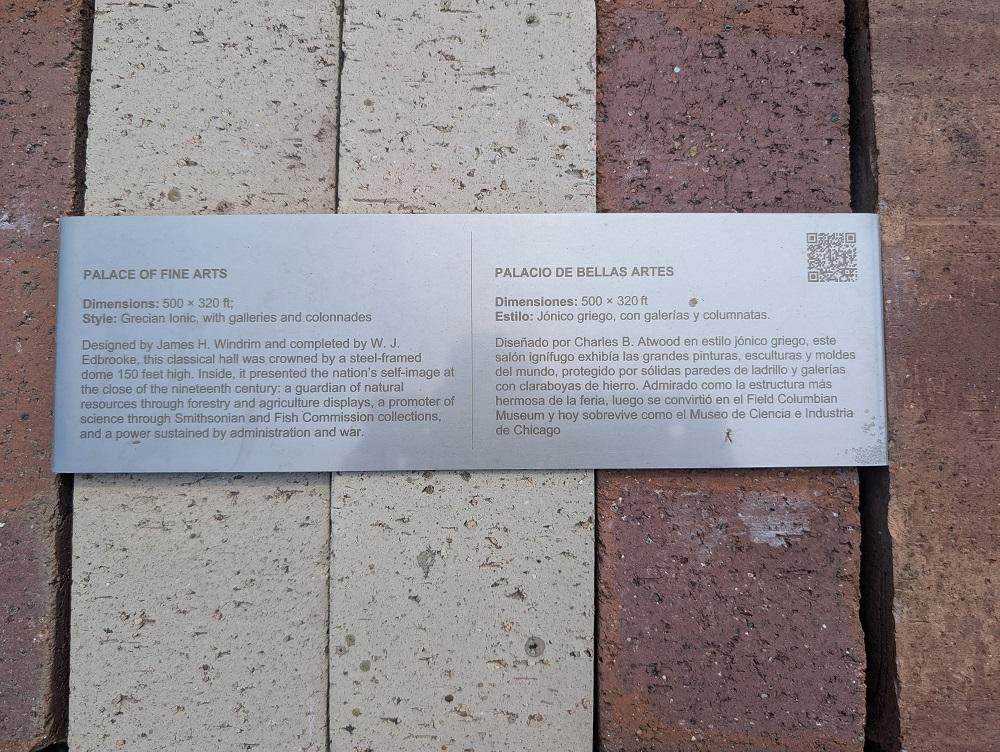This descriptive sign for the Palace of Fine Arts has (English) text for a different 1893 structure, the U.S Government Building