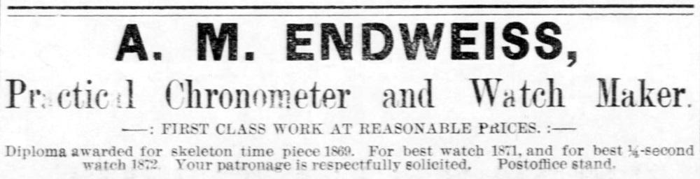 An advertisement for A. M. Endweiss’s new watch business in Emporia, Kansas. [Image from the Emporia Evening News, Oct. 14, 1887.]