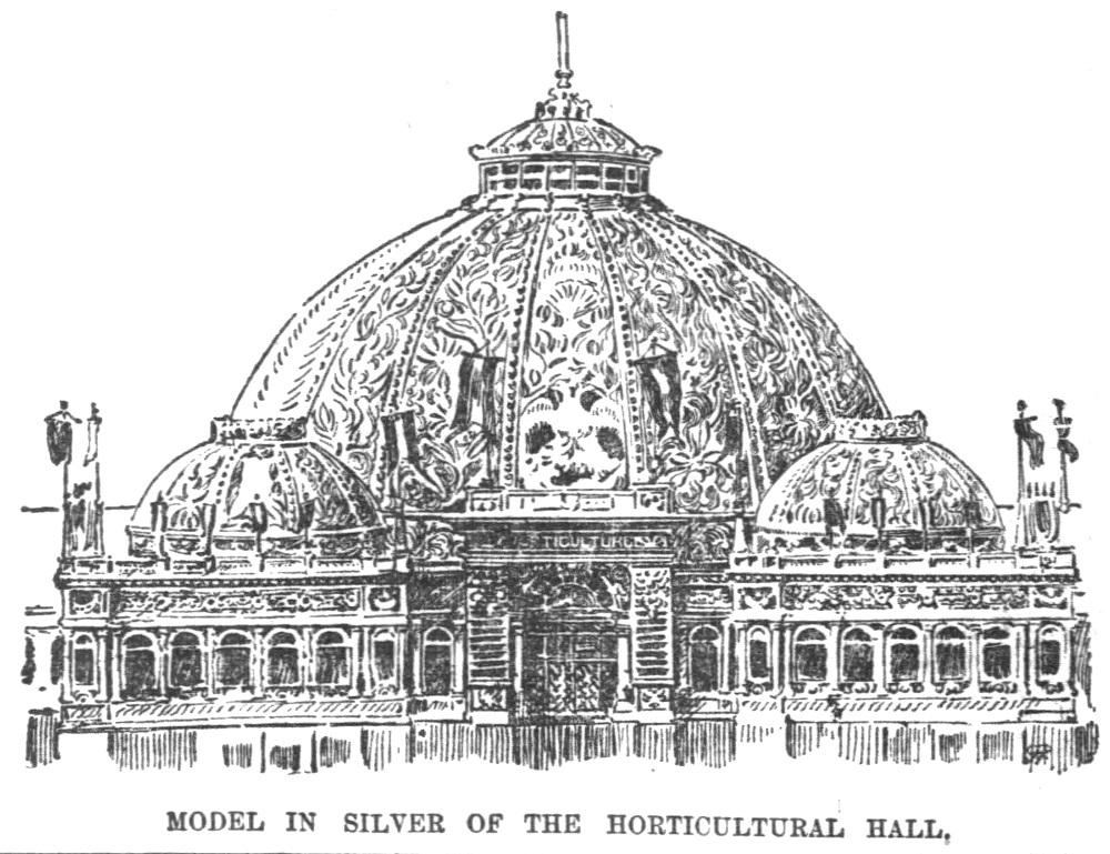 The central domed pavilion of a silver filigree model of the Horticultural Building made by Mexican artist A. M. Endweiss. [Image from American Gardening May 1893.]