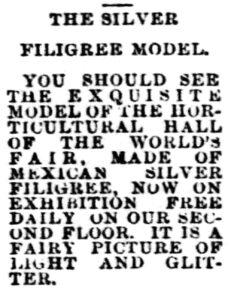 “Silver Model of Horticultural Hall” Chicago Tribune Dec. 23, 1892, p. 10.
