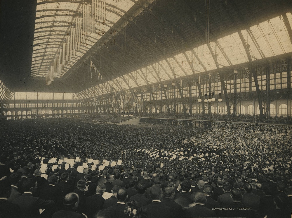 A photograph by C. D. Arnold showing the view looking north in the Manufactures and Liberal Arts Building on Dedication Day. The Exposition Orchestra and combined choruses (foreground) performed for the largest crowd ever assembled under one roof. [Image from the C.D. Arnold Photographic Collection, Chicago Public Library.]