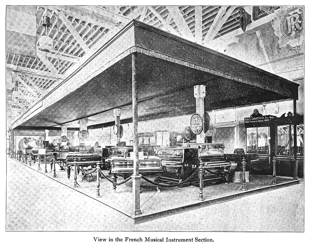 View of the French musical instruments section in the gallery of the Electricity Building, where M. V. Mustel exhibited his celesta. [Image from Musical Instruments at the World’s Columbian Exposition. Presto, 1895.]