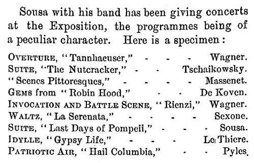 Concerts performed by the Sousa Band at the 1893 World’s Fair had the Nutcracker Suite included on what an East-coast music magazine described as programs “of a peculiar character.” No concert date for this “specimen” repertoire was given. [Image from Freund’s Weekly Jun. 3, 1893.]