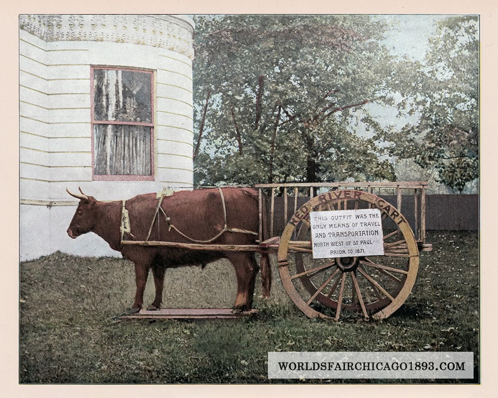 A FRONTIER OX-CART.—As a sort of annex to the North Dakota Building, there stood outside, upon the greensward, what was called a Red River Ox-Cart. It stood there as representing the only means of conveyance known up to within a little more than twenty years ago throughout the vast territory now composing the two Dakotas. It was simply a stuffed ox, hitched to a cart. It was an amiable-looking ox, one so amiable that it might have been mistaken for a cow, and the cart was quite as commonplace as the animal. But the thing as a whole, standing beside the building of the prosperous grain state now threaded by good highways, along which good horses travel, now having railroad accommodations, now a modern state with modern ways, made a most interesting contrast. So absurd and apparently out of place amid its surroundings was this exponent of past frontier life that, in fact, it attracted more attention than did the building of today; that is, it attracted more attention from the passers-by. This representation was a very clever idea of the North Dakotans. It drew constant attention to the marvelous progress of the state of which they are so justly proud. It is not surprising, though, that such an idea occurred to them. The great Northwest taught the East many clever things during the Fair. Feeling their own strength, those states so lately territories did not hesitate to call attention to themselves. They did it adroitly and dramatically, but behind all was the dignity of real possession of everything that was claimed.
