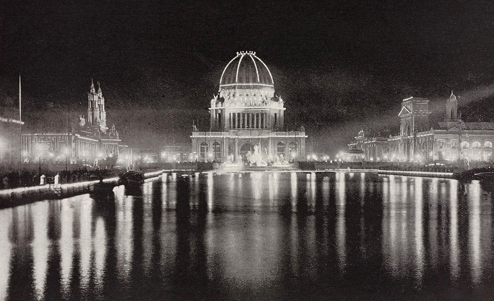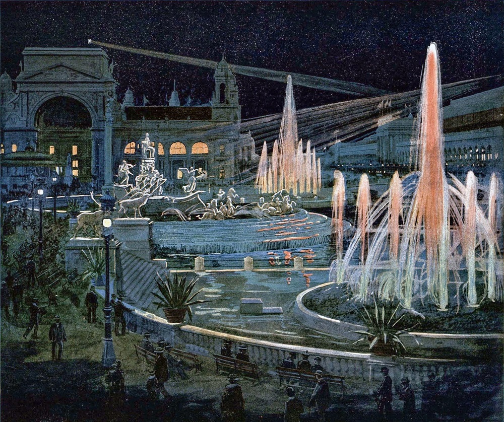 The Grand Basin at night, showing search lights. [Image from Picturesque World’s Fair (W.B. Conkey, 1894); image digitally edited.]