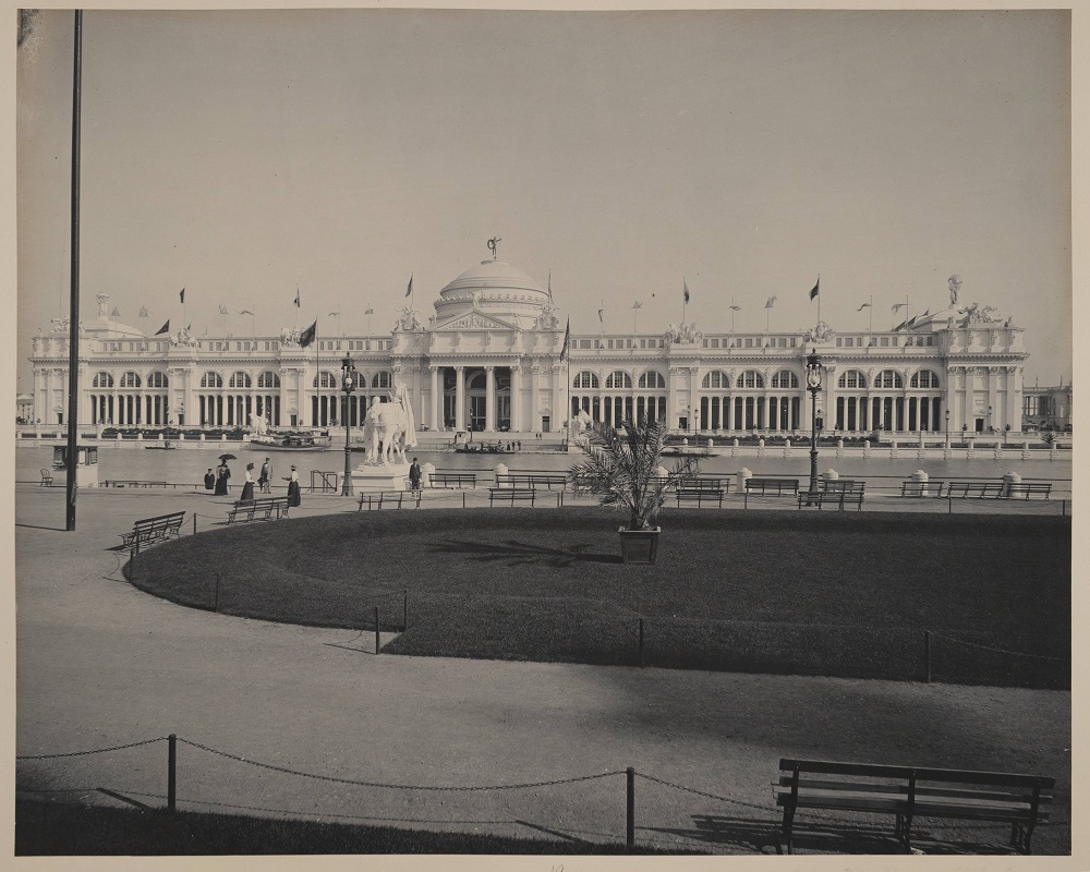 Photograph by C. D. Arnold of the Agricultural Building, looking south across the Grand Basin from the Manufactures and Liberal Arts Building. [Image from the C.D. Arnold Photographic Collection, Chicago Public Library Special Collections & Preservation Division.]