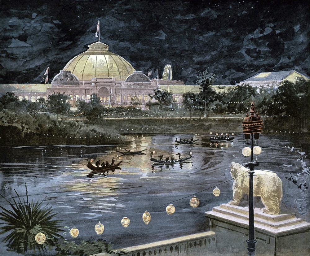 The Lagoon at night, with “gaily-colored gondolas busily plying the waters.” [Image from Vistas of the Fair in Color. A Portfolio of Familiar Views of the World’s Columbian Exposition (Poole Bros., 1894).]