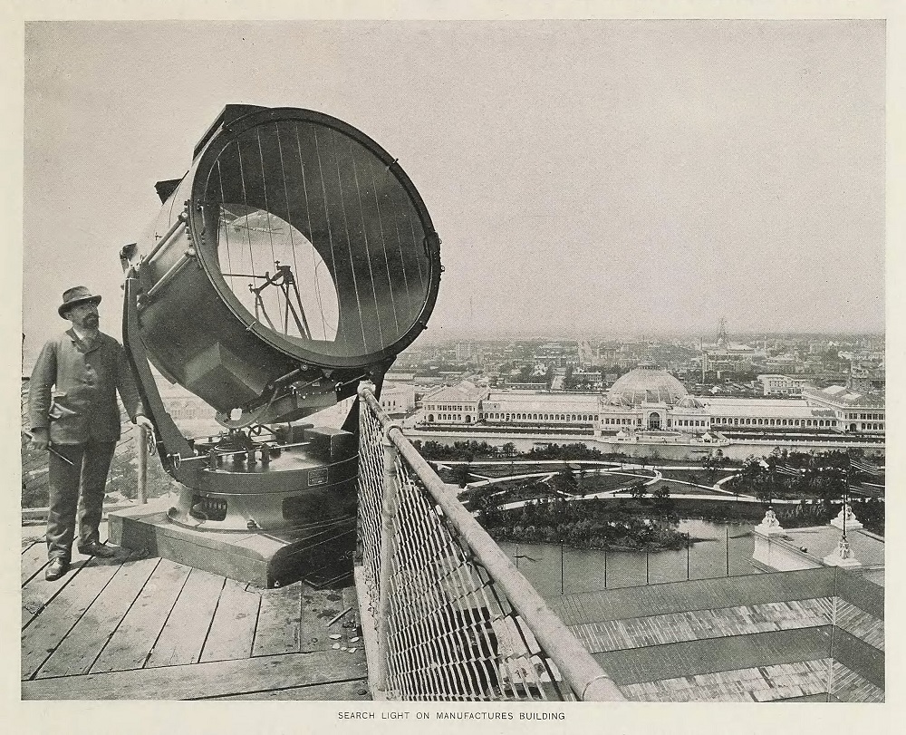 A search light on the roof of the Manufactures and Liberal Arts Building. [Image from Bancroft, Hubert Howe The Book of the Fair (The Bancroft Company, 1893).]